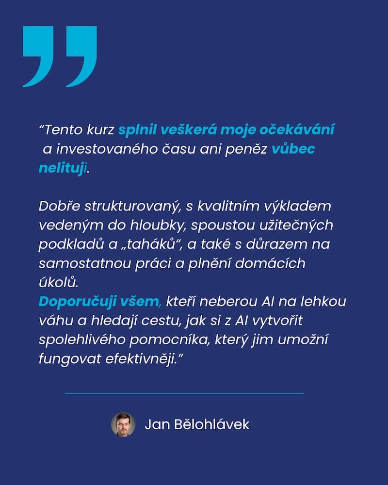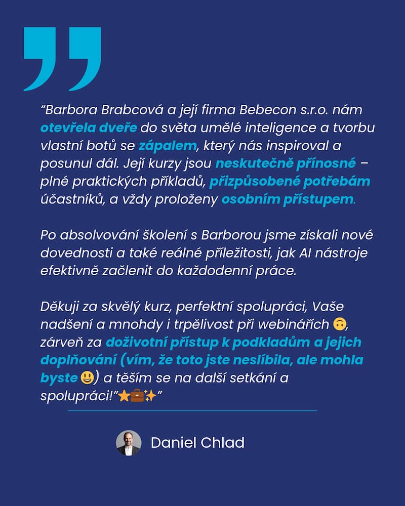 - Naučíte vlastního AI asistenta analyzovat vaše data, zohlednit přitom situaci vaší firmy a na základě toho provádět vizualizace, grafické zpracování dat a doporučení pro další postup ve vaší firmě.
