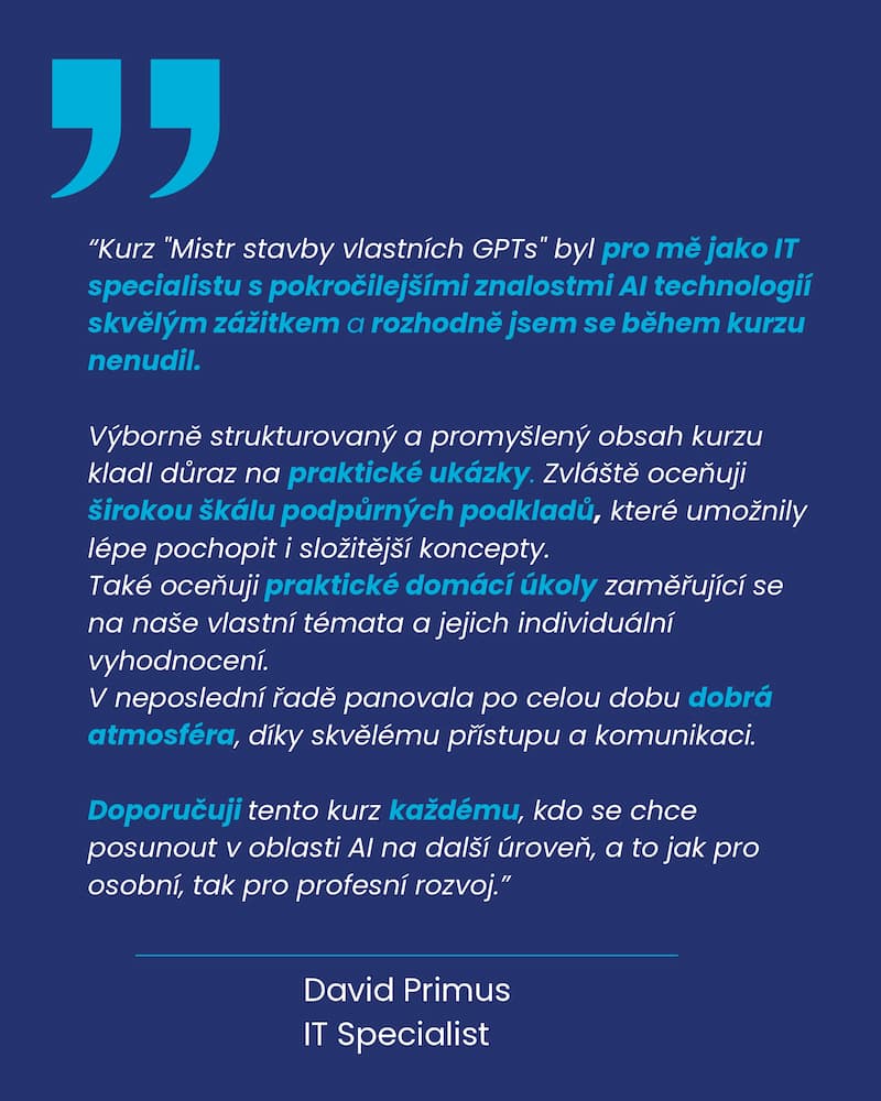 - Postavíte si svého vlasního AI asistenta podle vašich preferencí a naučíte se stavět jakhokoli dalšího vlastního v budoucnu na platformách ChatGPT, Claude a Copilot.