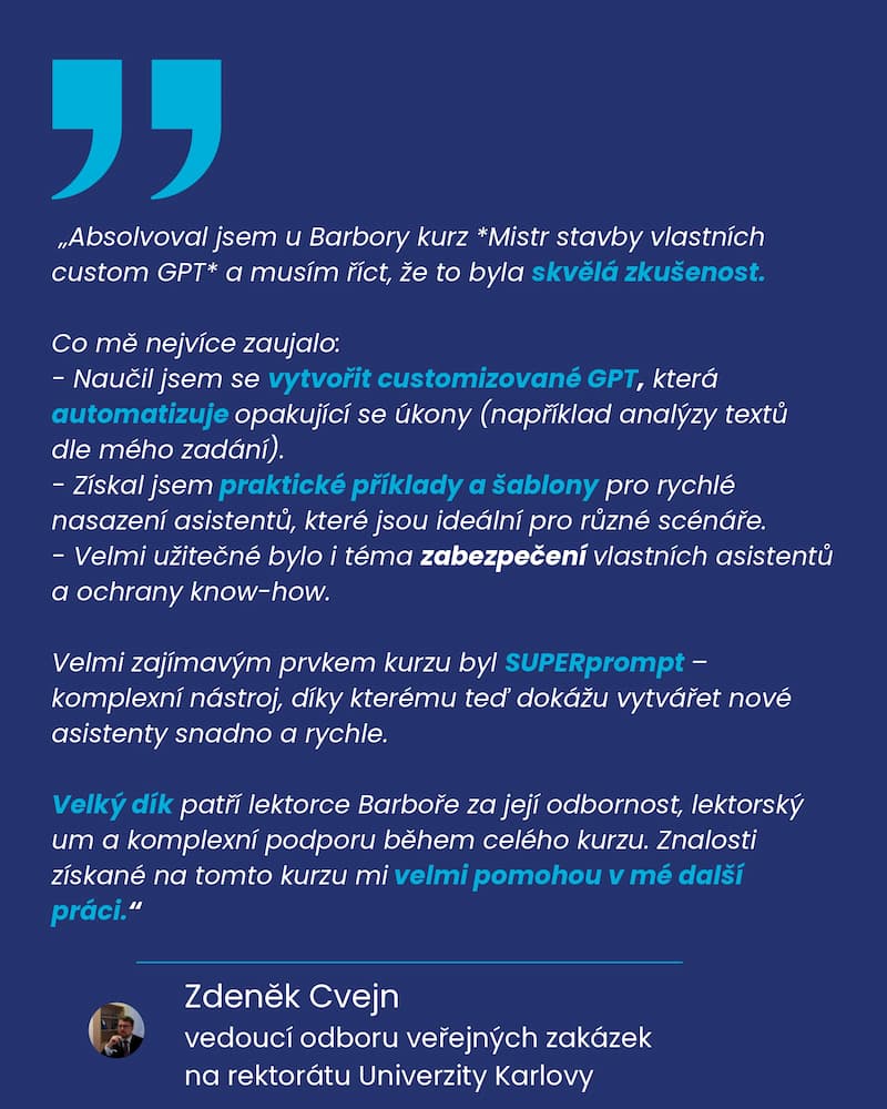 - Naučíte se ochránit si své know-how a svá data ve svých AI asistentech tak, aby vám je nikdo nemohl odcizit.