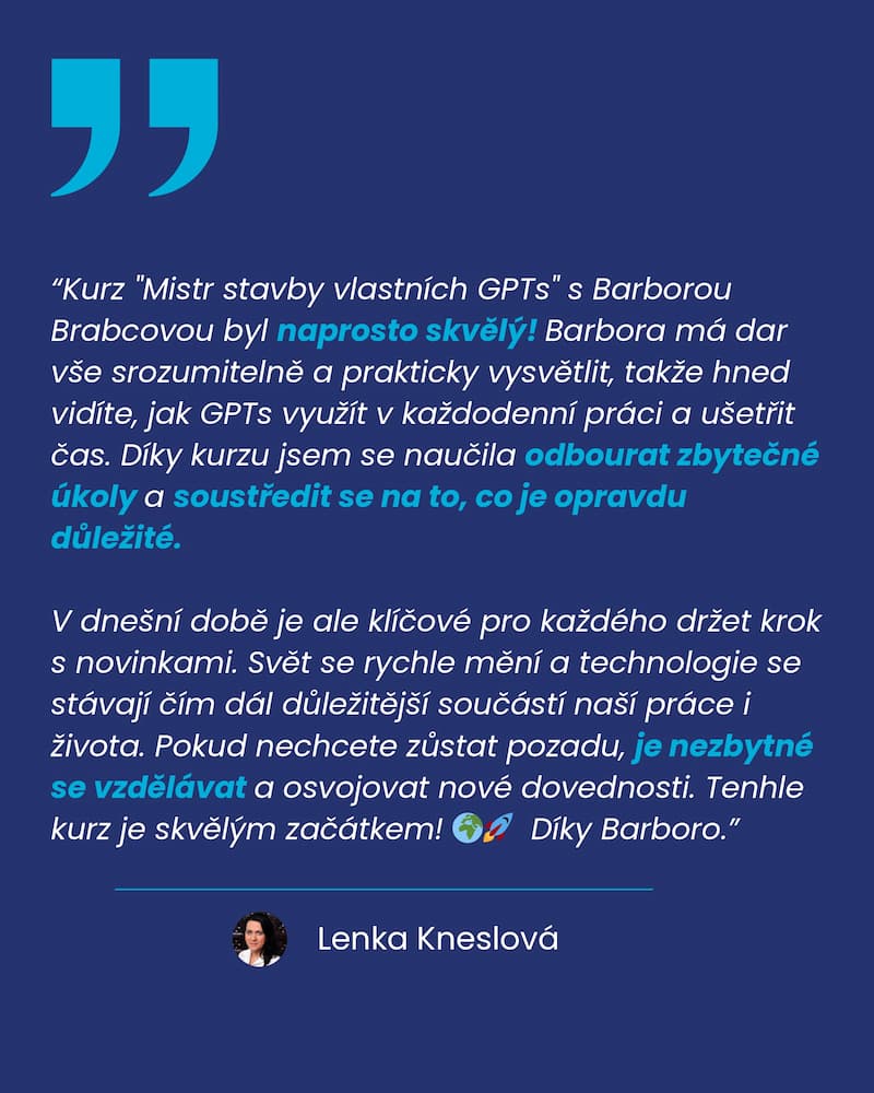 Čtyři setkání na dvě hodiny online ve vybraném termínu, veškeré materiály, samostatná práce na úkolech a projektech, a moji podporu na WhatsApp. SUPERprompt na tvorbu jakéhokoli GPT do budoucna. Trvalý přístup do členské sekce s aktuálními tipy a triky. Placený účet ChatGPT není v ceně kurzu.